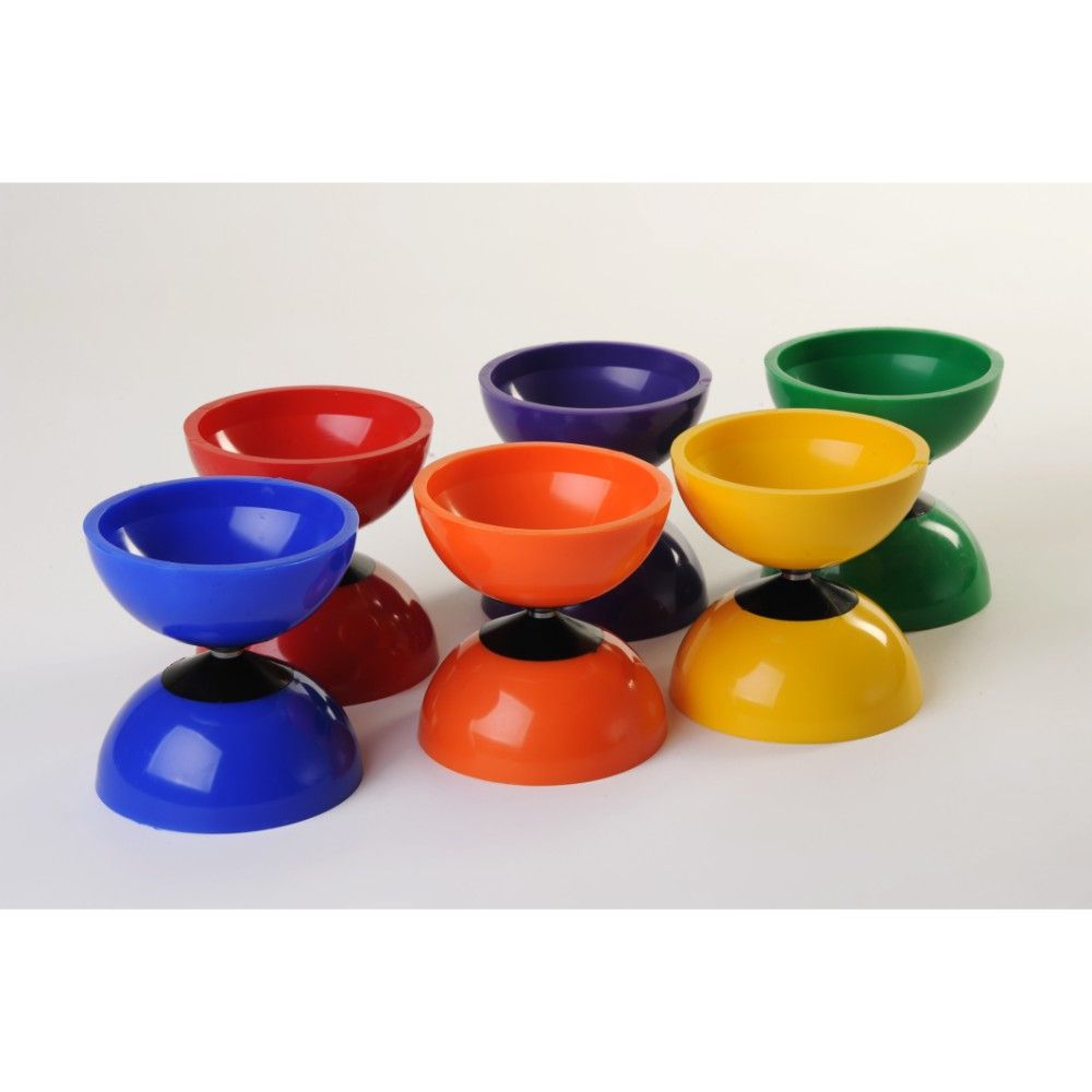 El diábolo consiste en dos semiesferas huecas que se manipulan con una cuerda atada a dos palillos, uno en cada mano.