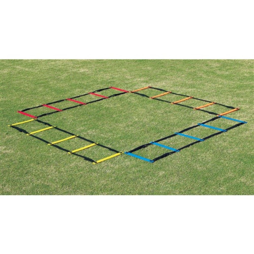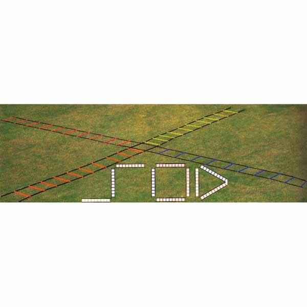 Se trata de 4 escaleras independientes de 4 mt de longitud por escalera, su sistema de clips al final de cada tramo te permite unir varias escaleras, fijarlas / combinarlas entre si en diferentes formas, para conseguir circuitos personalizados y adecuarlos al trabajo especíifico que se desee realizar con los jugadores / atletas. creando circuitos más largos o diferentes formas geométricas,